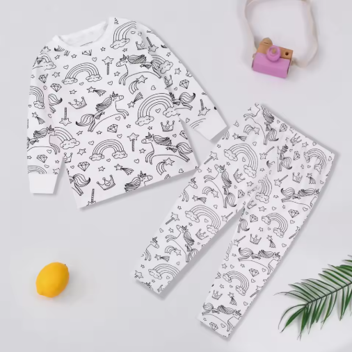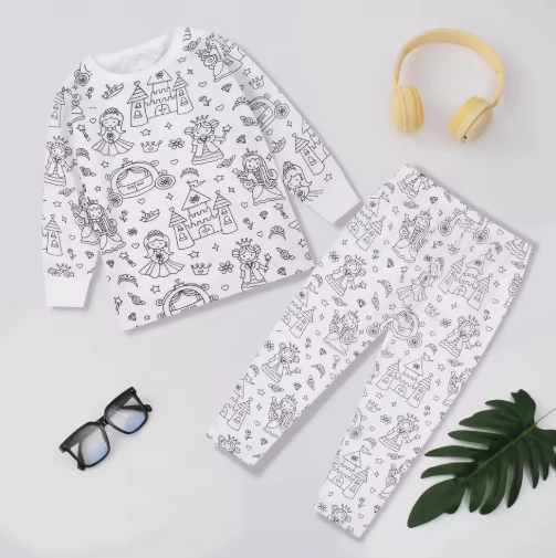 As linhas simples e o fundo branco foram projetados especialmente para facilitar a pintura e despertar o interesse visual das crianças, tornando o pijama uma verdadeira obra de arte personalizada.